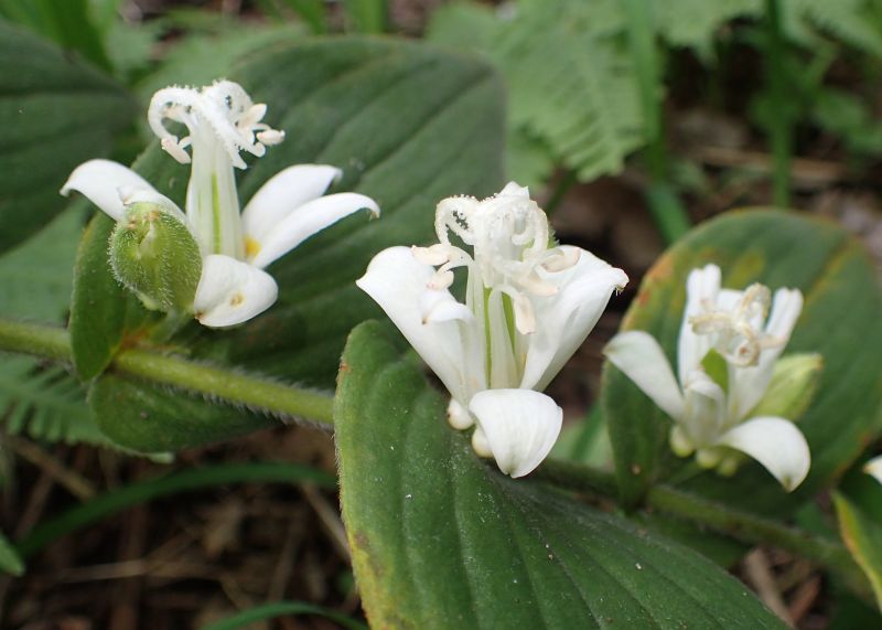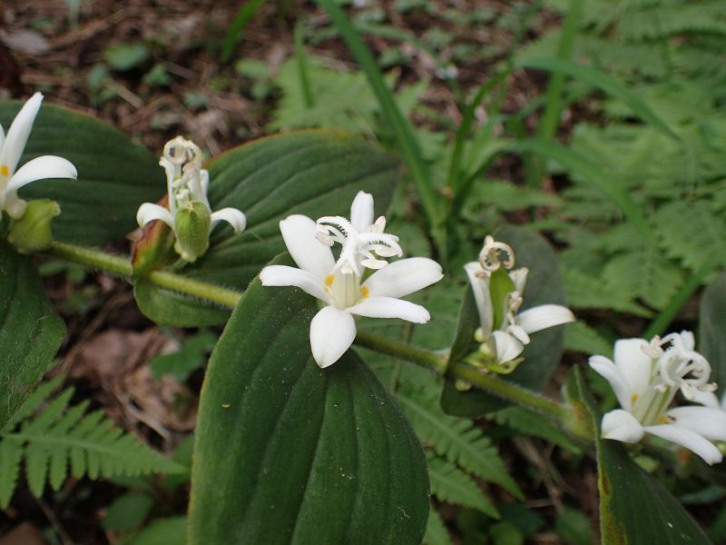 シロバナホトトギス。花柱の裂片に腺毛状の突起があり、茎に上向きの毛がある。