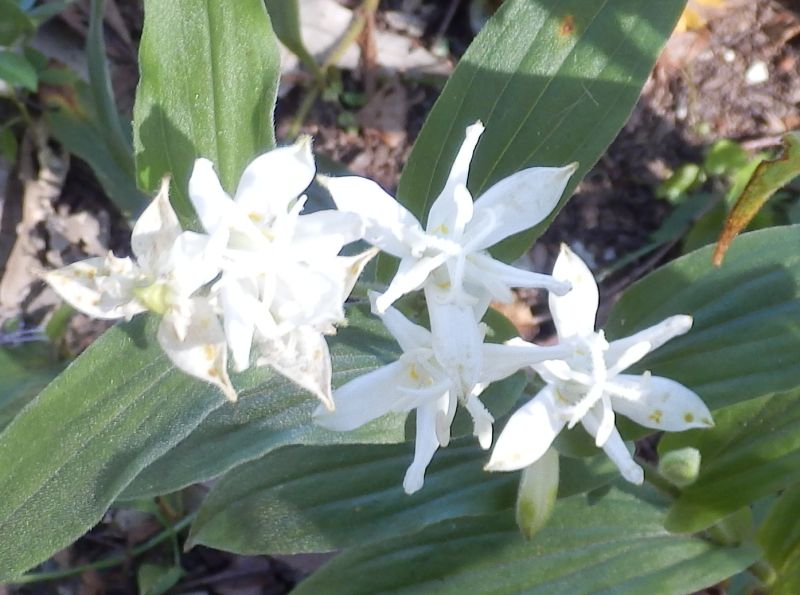 雄しべの基部にまで紫色の斑点がある。茎に上向きの毛がある。