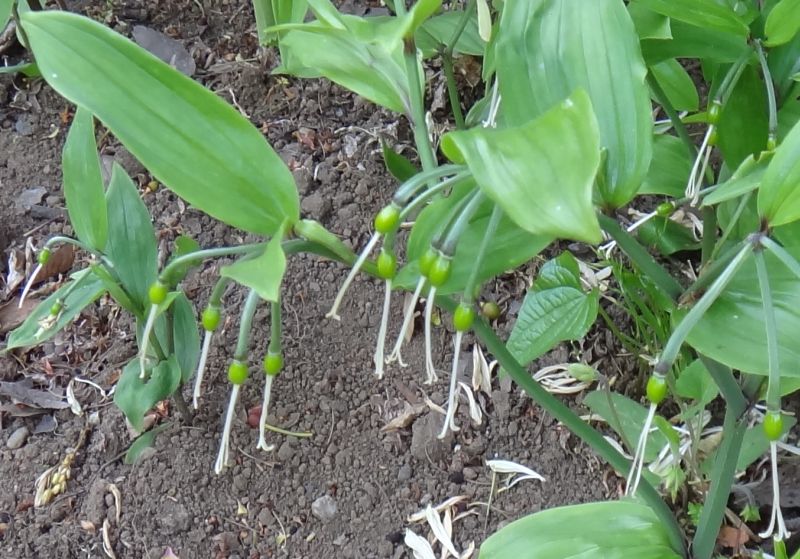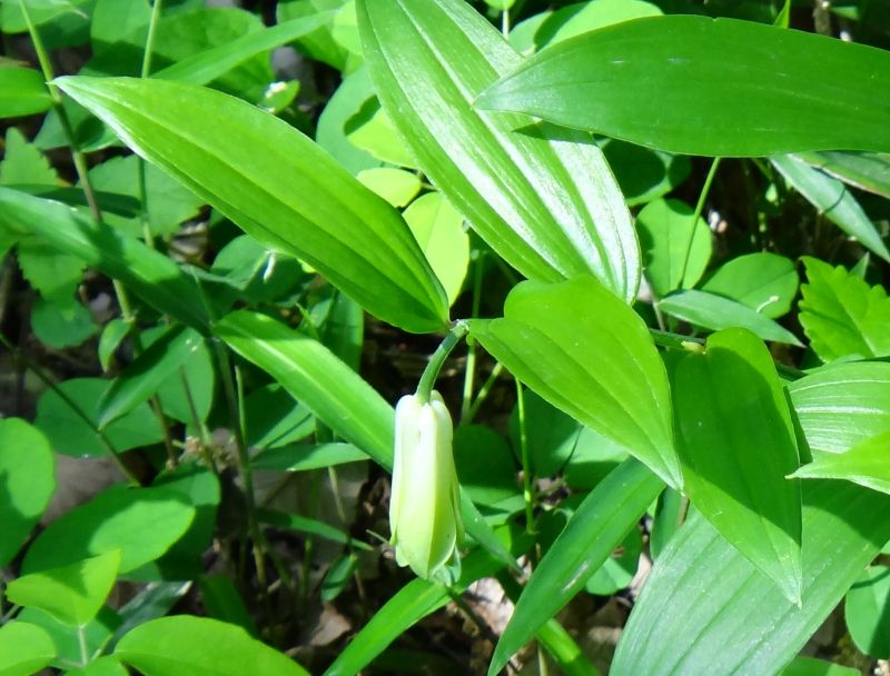 アマドコロ :筒状花が1〜2個ずつ垂れる、花弁は合着、茎は弓形で丸くて滑らか、節間が長い、葉幅は2〜5センチ、高さ30〜50センチ。