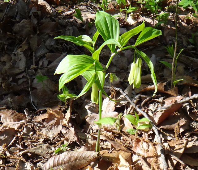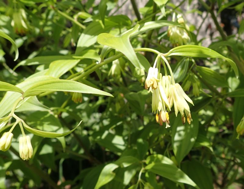 オオアマドコロ:筒状花が2〜4個ずつ垂れる、花弁は合着、茎は弓形で丸くて滑らか、節間が長い、葉幅は3〜8センチ、高さ60〜100センチ。