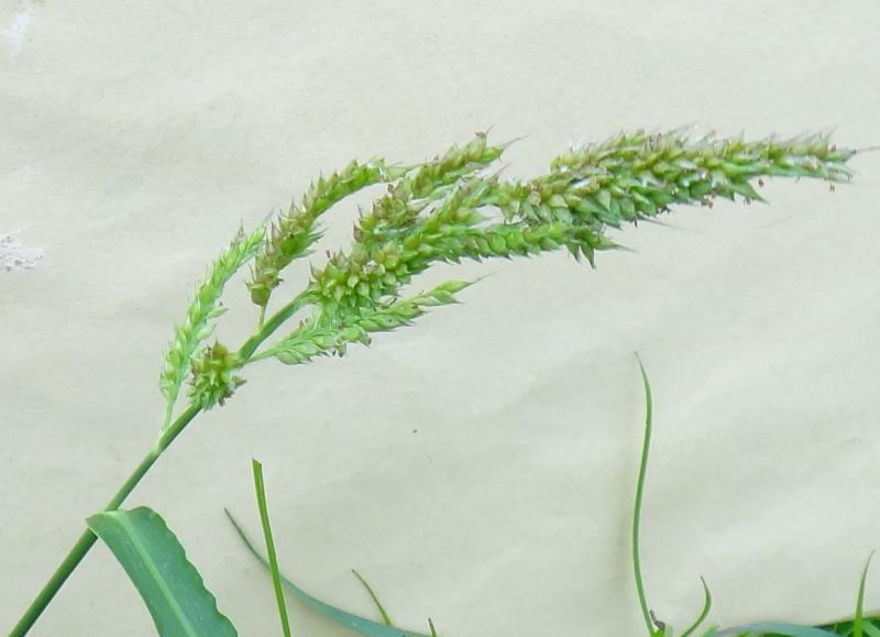 小穂は枝の片面に密生する。小花は淡黄色である。