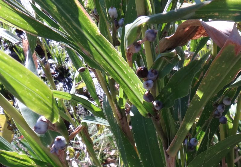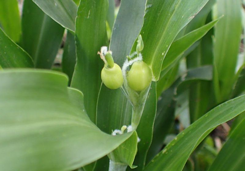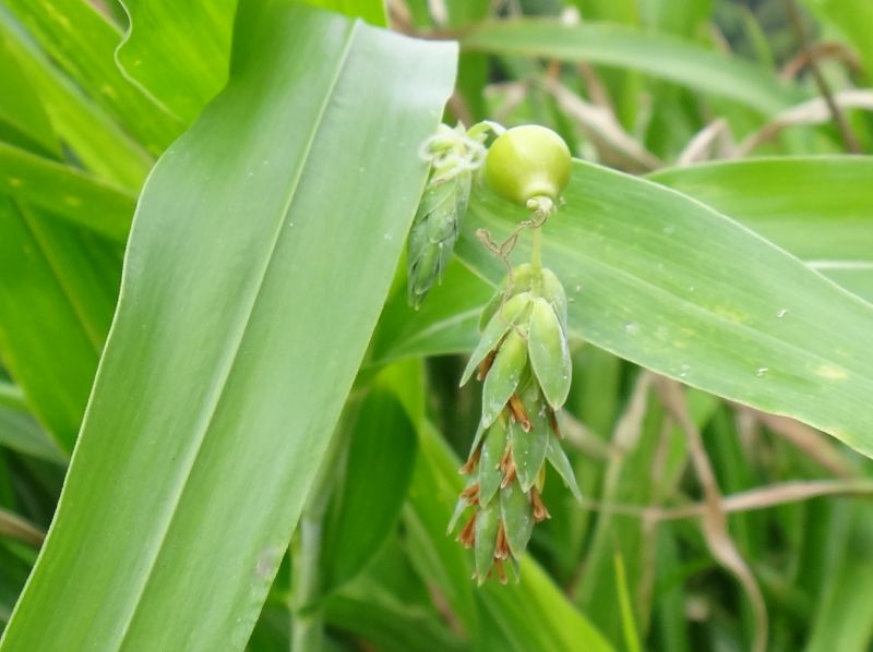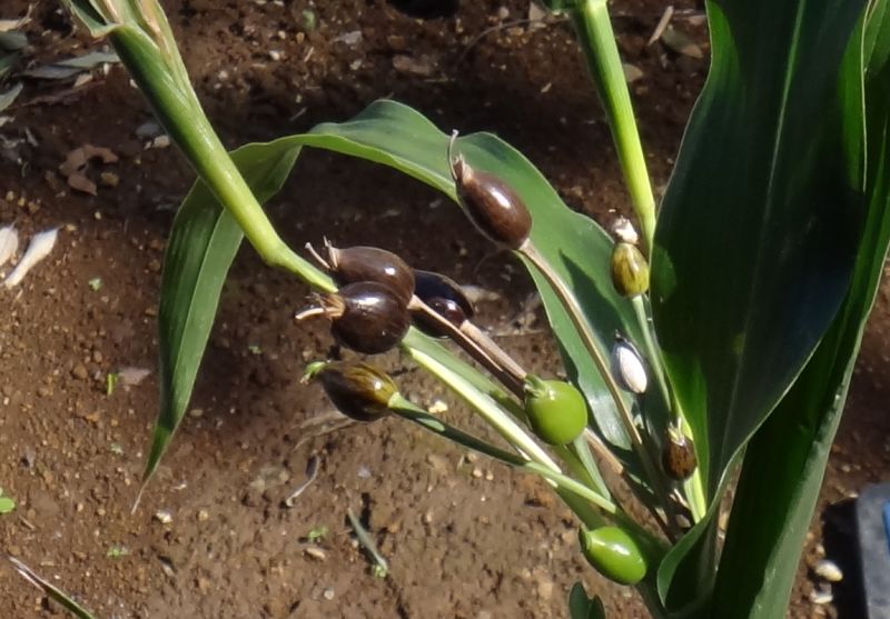 果期の苞鞘は青みがかかって固くてつやがあり、数珠玉のように見える。