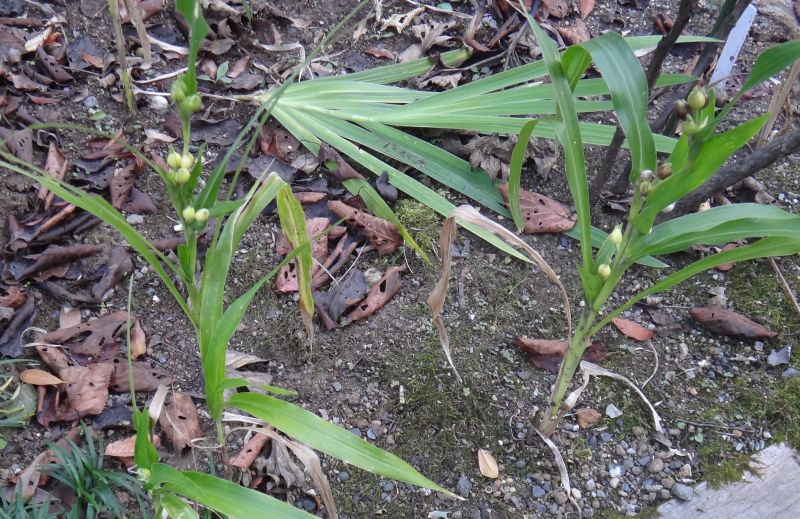 茎は直立し、幅広の線形の葉が互生する。(後方で倒れているのは別の植物)(2015/10/8)
