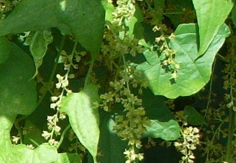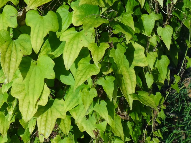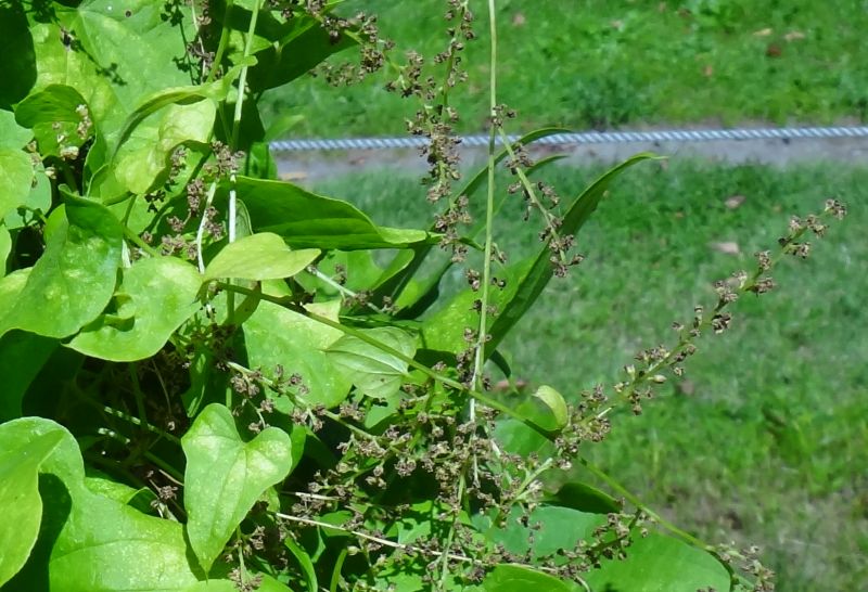 タチドコロ:茎は直立後につる状となり、葉は三角状倒卵形、花は黄緑色、雄花序直立、ムカゴつかず、刮ハに半円形の3翼。