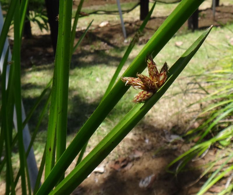 苞は3稜形なので、直立すると、穂が茎の途中に横向きについて