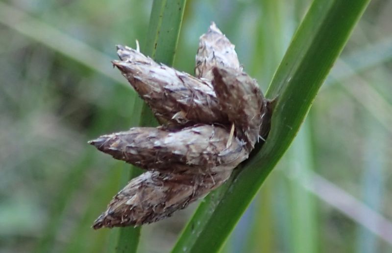 3稜のある茎に、柄のない卵形の小穂が頭状に数個かたまってつく。