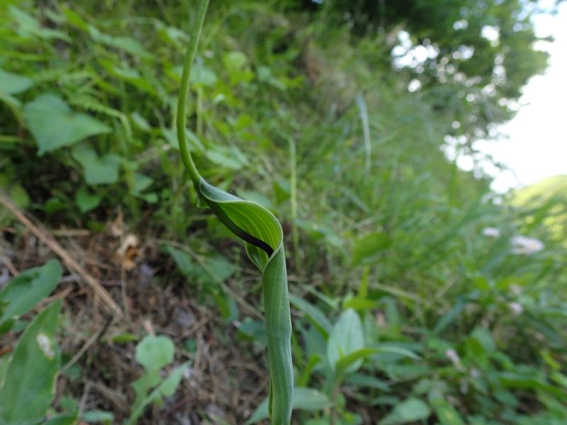 仏炎苞には縦筋があり、中程にくびれがあり、下半分は少し細い。(2017/5/18)