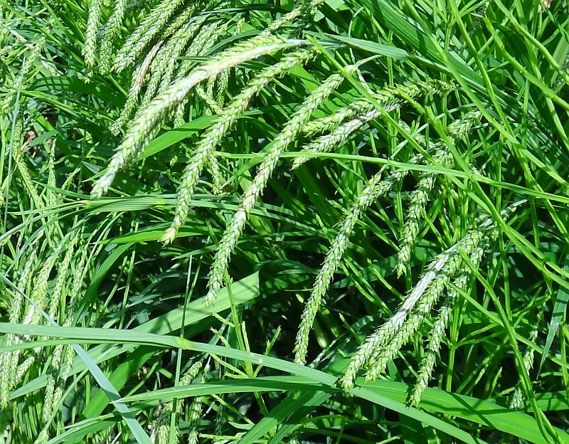 茎先から4〜6個の淡緑色の小穂が少しずつ間をおいてつき、