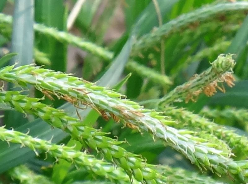 頂小穂の先の太い部分は雌花で、その下の細い部分は雄花、