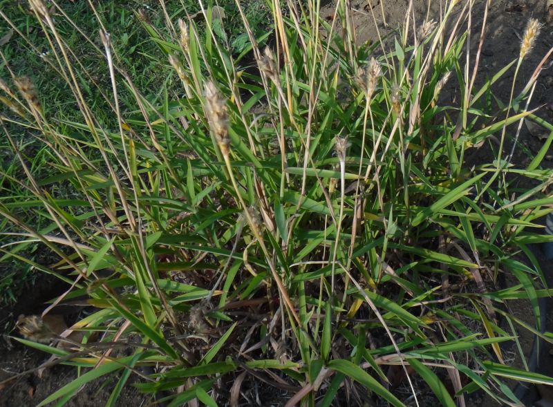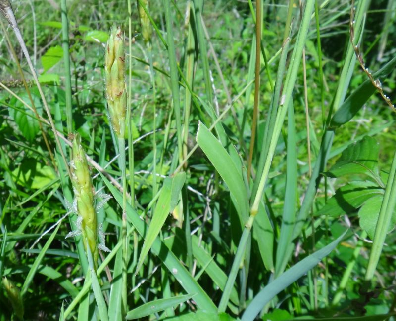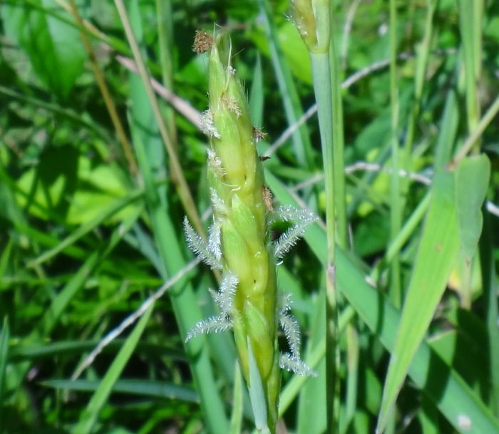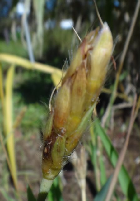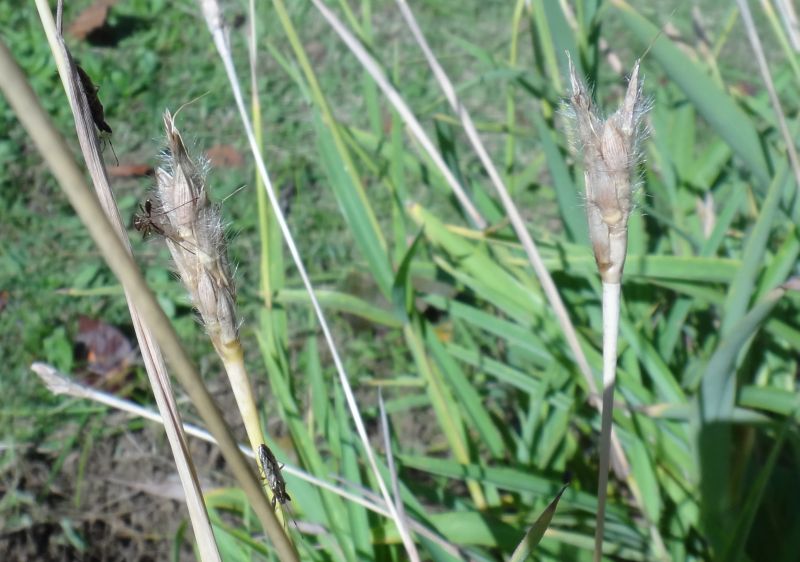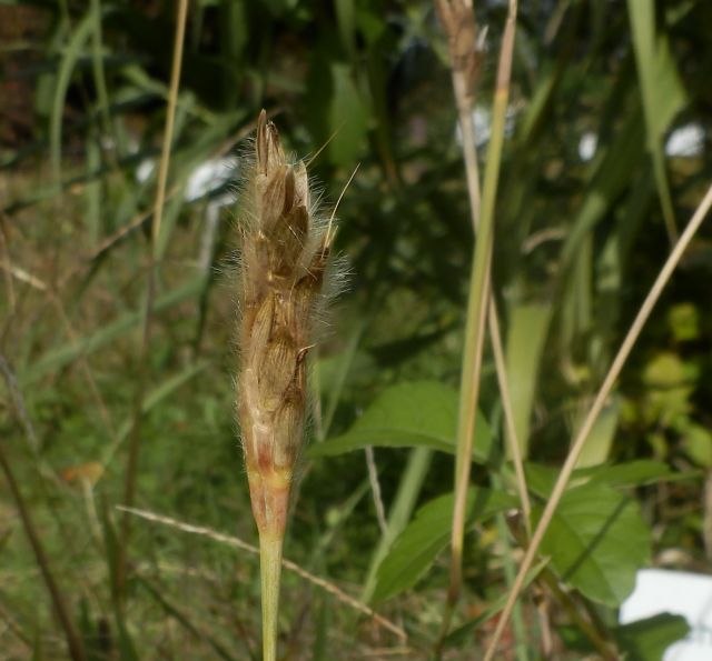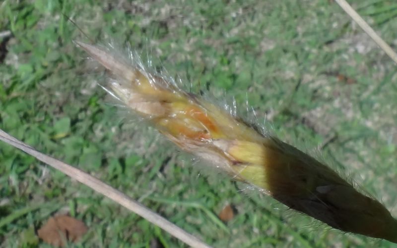 柄の短い小穂と柄の長い小穂が対となり、短柄の小穂には芒があり、長柄の小穂には白毛がある。