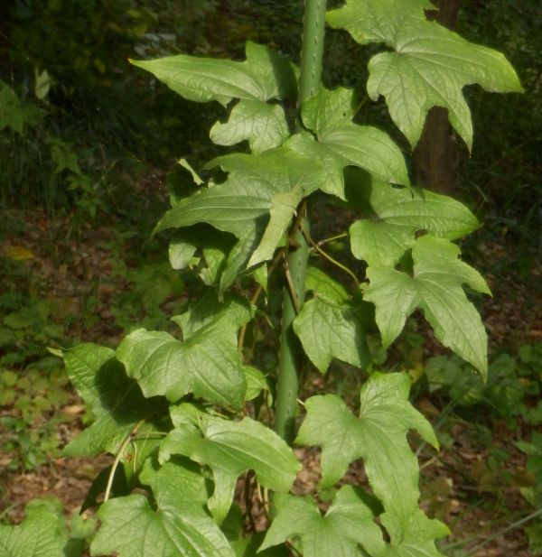 葉は互生し、長さ12〜19センチの大型で、カエデのように掌状に5〜9裂し、