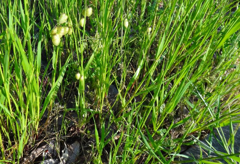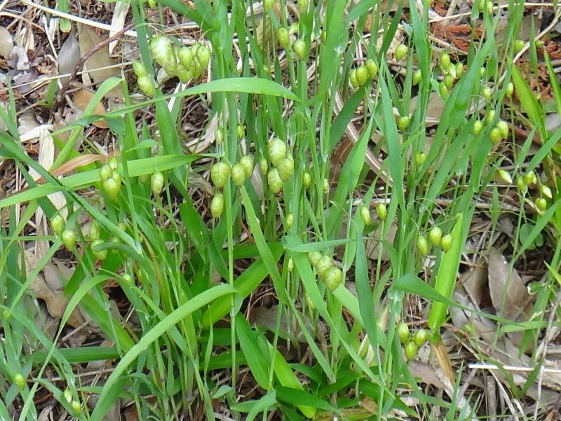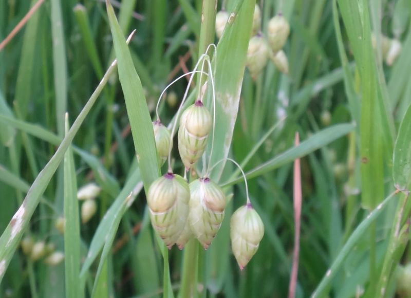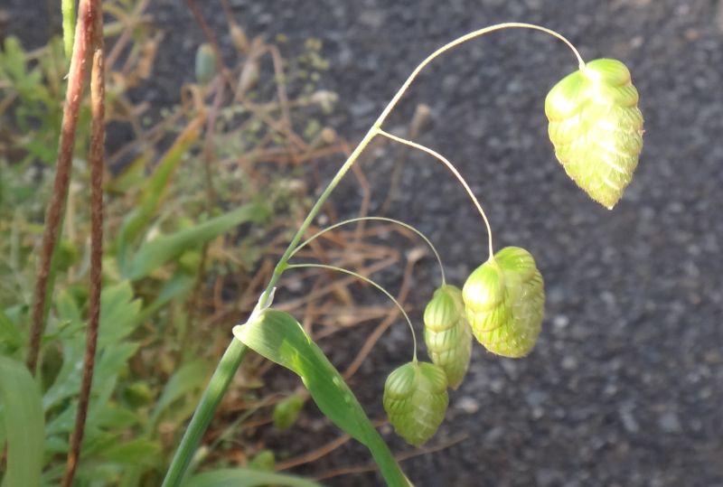 小判のような形をした卵状楕円形の小穂が細い糸状の柄の先に垂れ下がる。