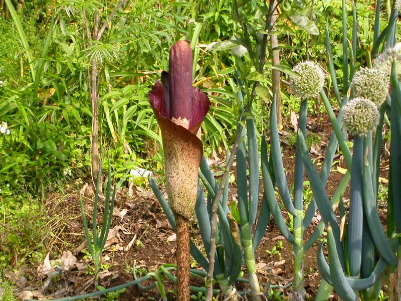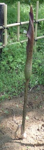 黒紫色の細長い仏炎苞の中に肉質で褐色の花序があり、悪臭がする。