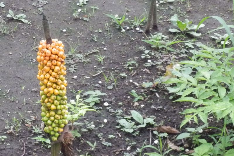 地中の丸くてやや扁平な芋から、まだら模様のある葉柄を出し、
