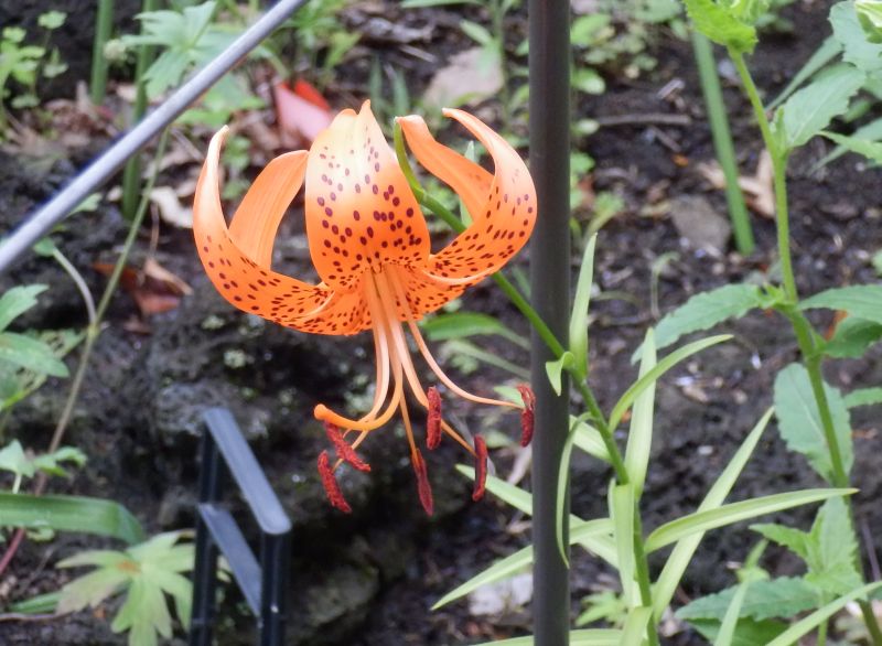 オニユリ :花は赤橙色で強く反り返り、夏咲き、結実希でムカゴがつく。