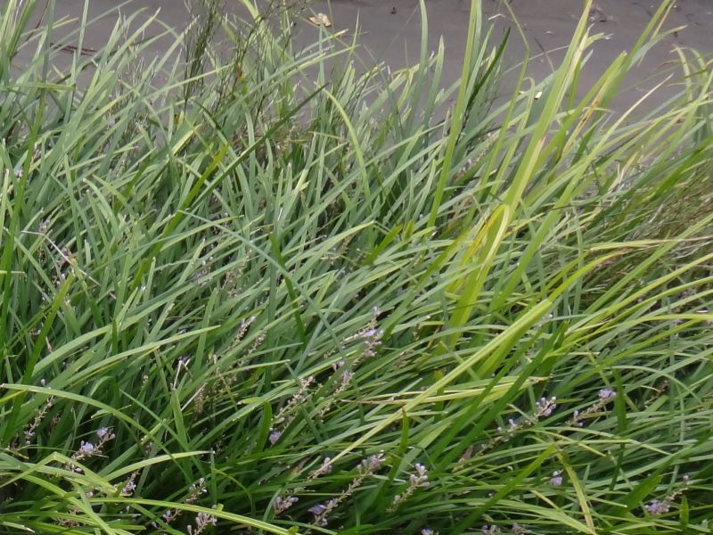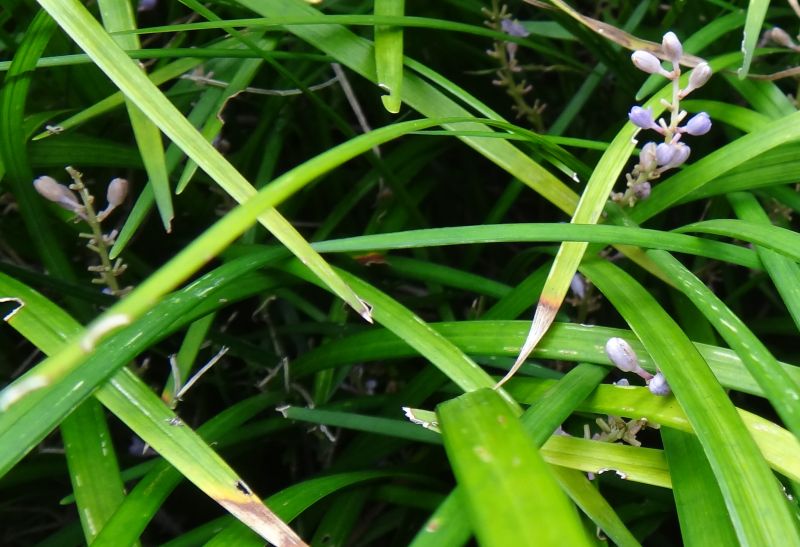コヤブラン :匐枝で広がる、葉の幅4〜7ミリ、花は色が薄くてまばらで20〜30個。