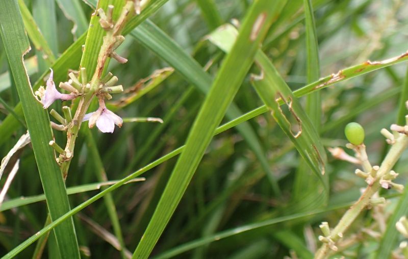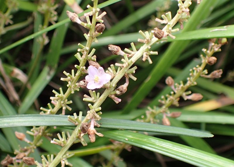 白に近い淡紫色の小さい6弁花が総状にまばらにつき、