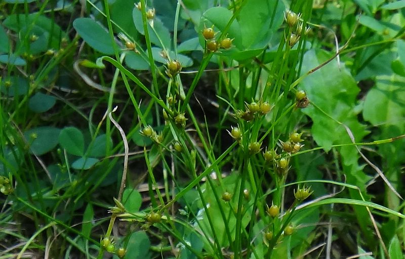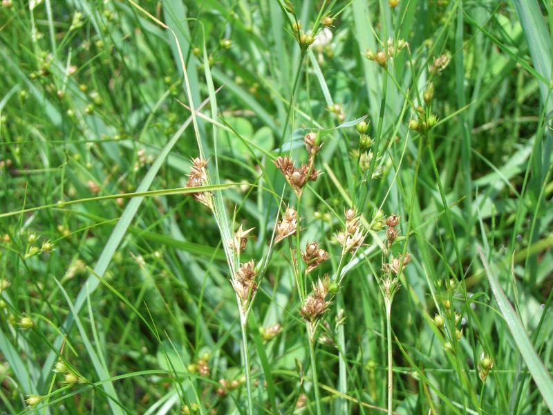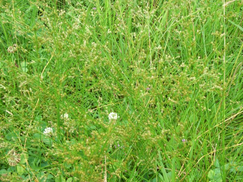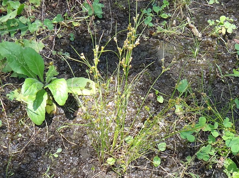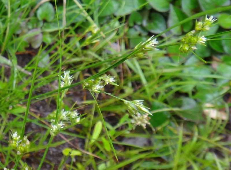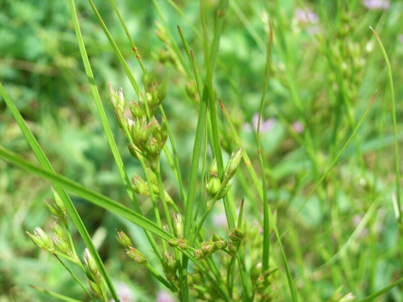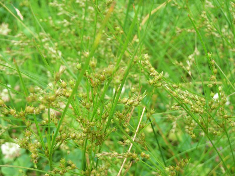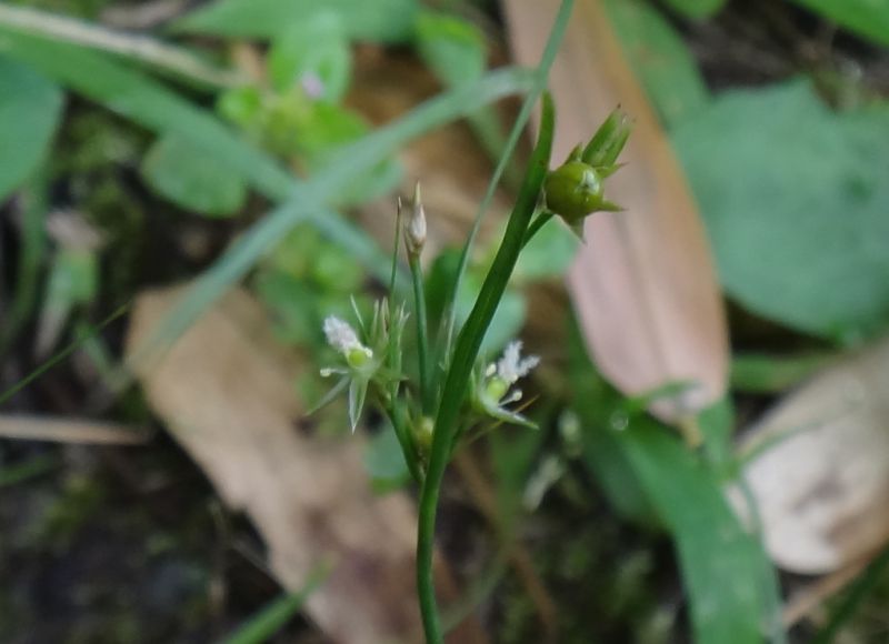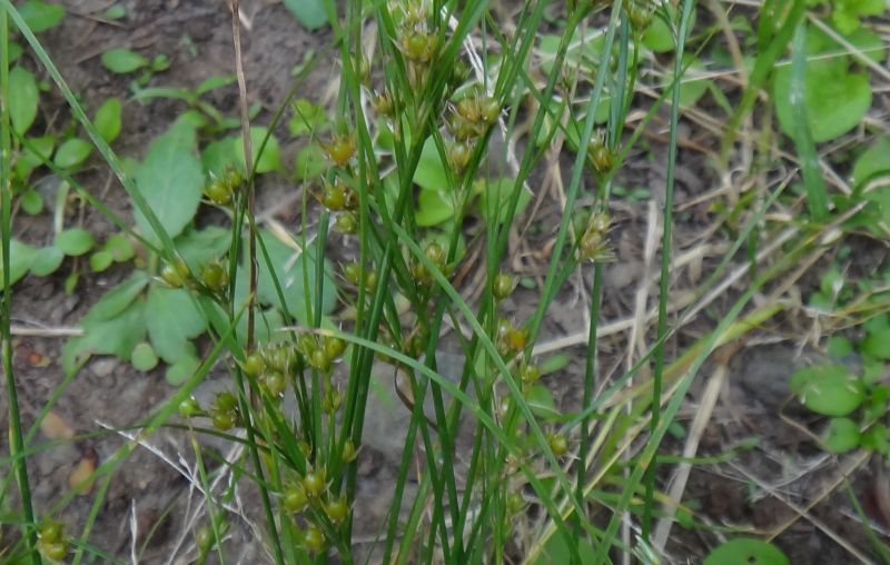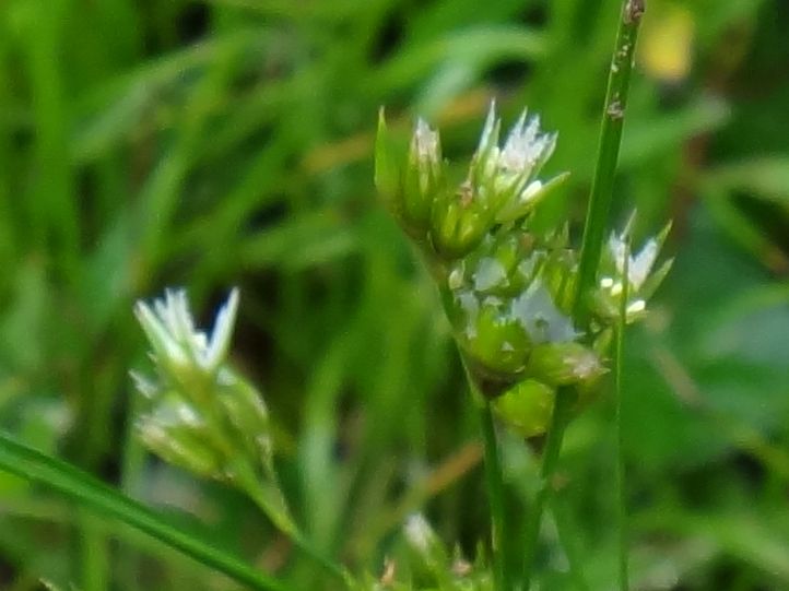 茎先の集散花序に被針形の花被片をもつ黄緑色の小さい花を多数つける。