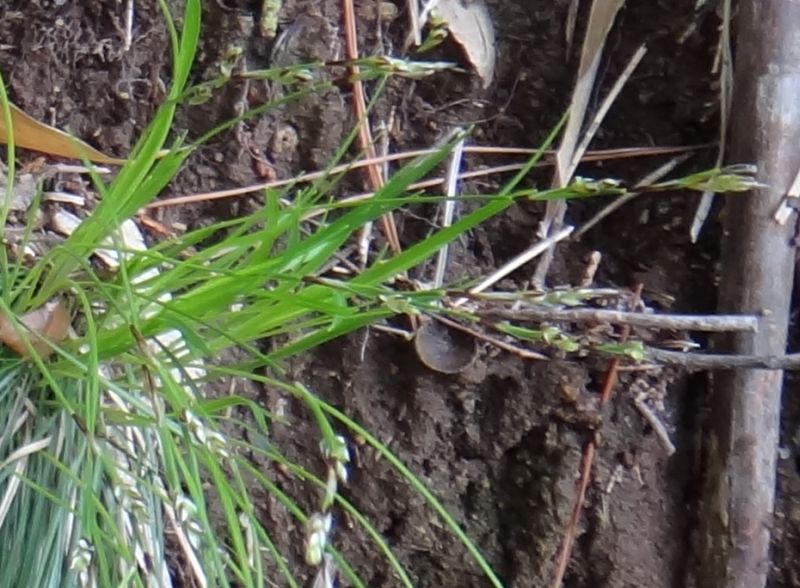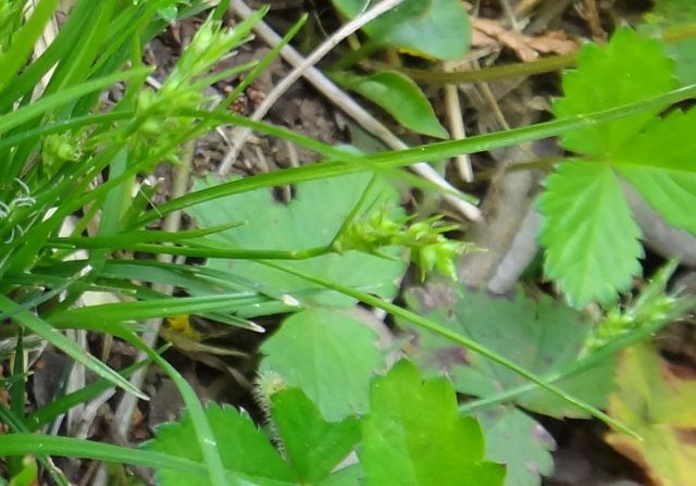 クサスゲ:葉は茎より長い、雄性の頂小穂は淡緑色で0.5〜1センチ、果胞は無毛。