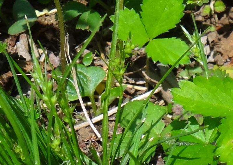 アオスゲ:葉は茎より短い、雄性の頂小穂は淡緑色で0.4〜2センチ、果胞に軟毛。