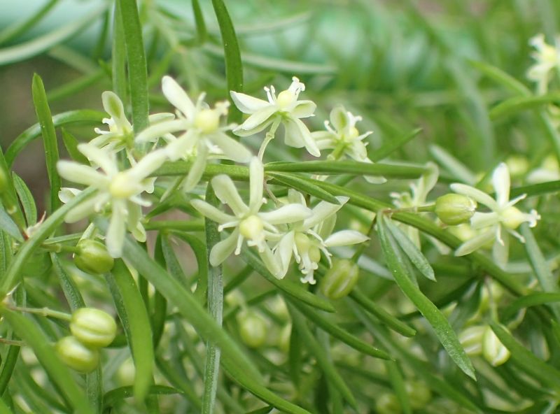 雌雄異株で、初夏に葉腋に淡黄色で6弁の花を2個ずつ付ける。