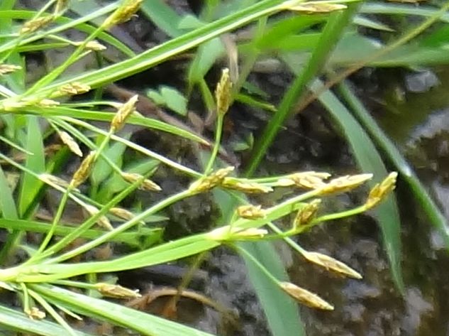 メアゼテンツキ:高さ5〜20センチ、茎先の複散形花序に黄褐色の小穂、短い芒あり。