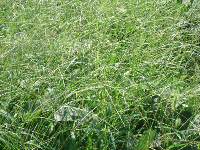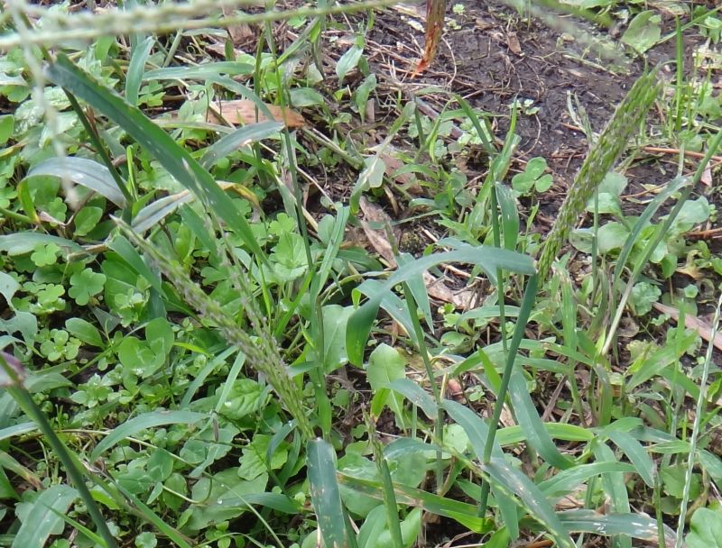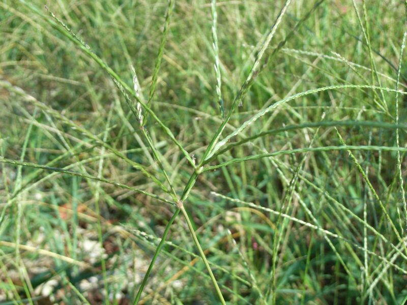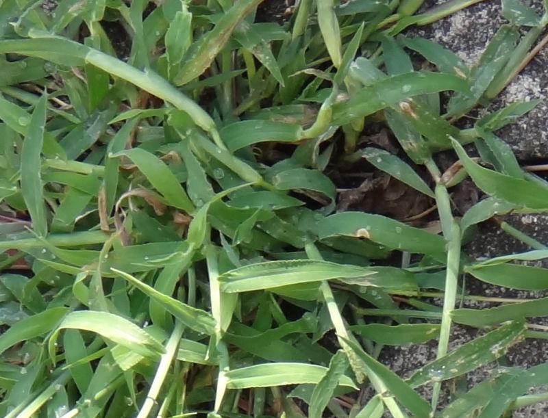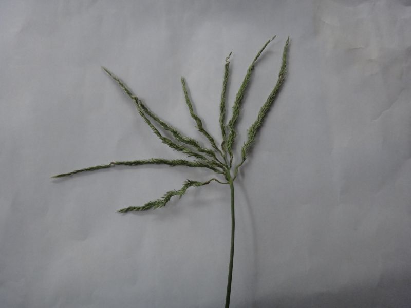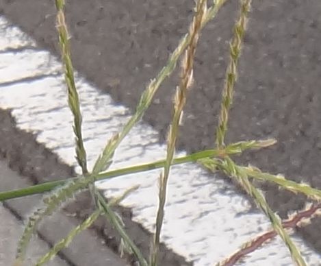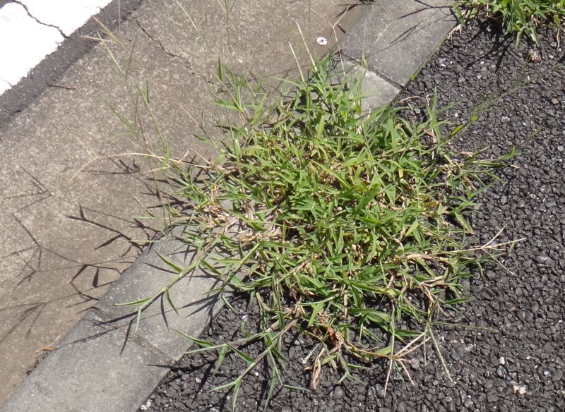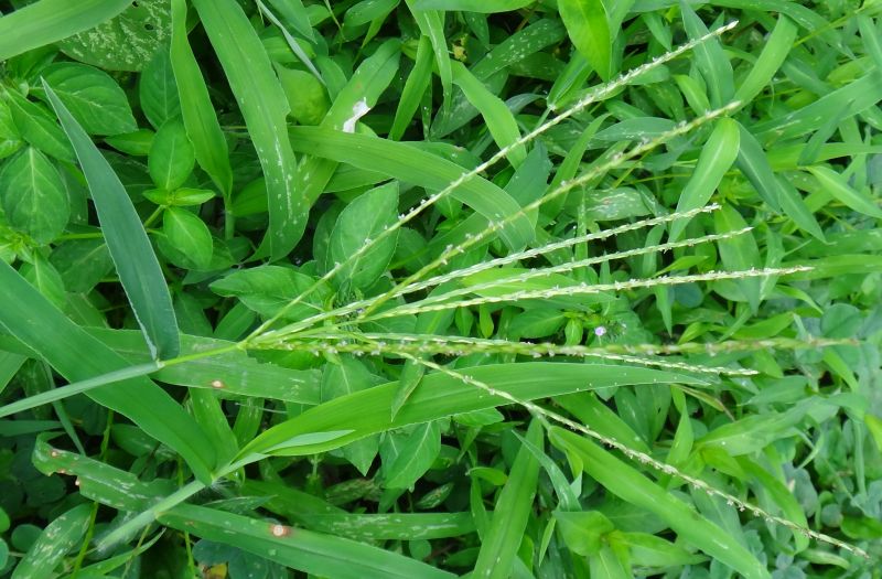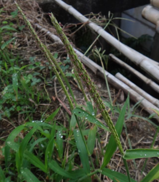 メヒシバ :葉は8〜20センチ、花序枝は3〜8本でざらつく。