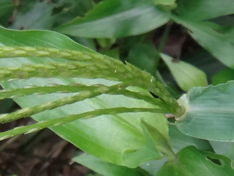 淡緑色または紫色を帯びた小穂が2列に並ぶ。