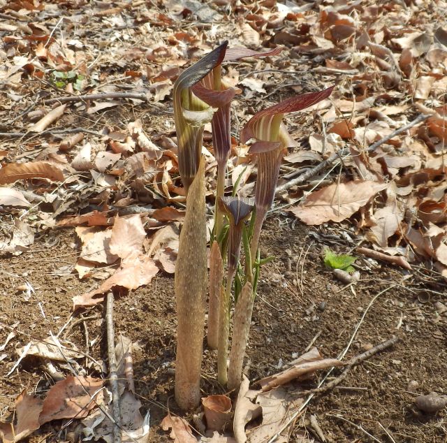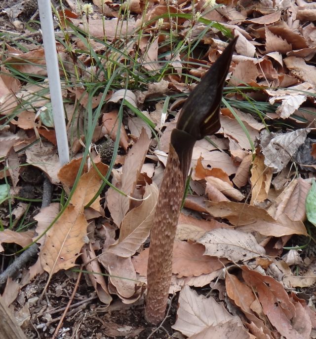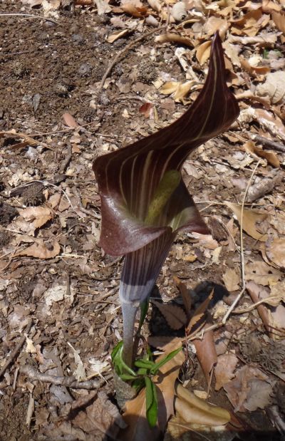 仏炎苞は覆い被さるように曲がり、基部は耳状に張り出す。(2017/3/30)