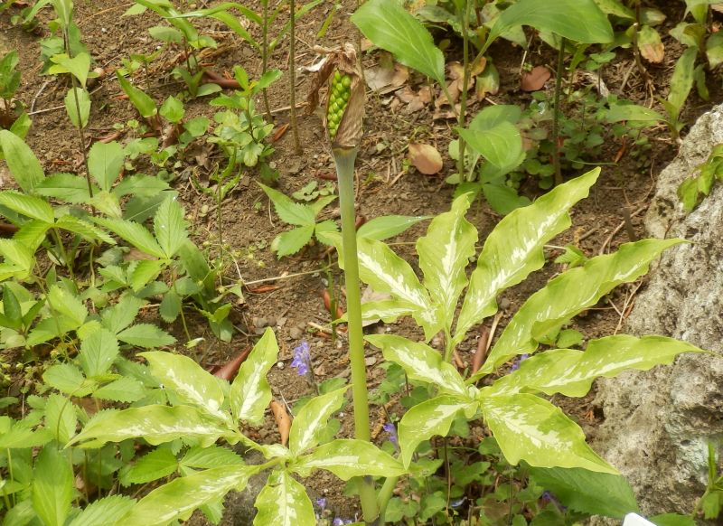 その先に上方がかぶさるように曲がった仏炎苞を持つ花をつけ、