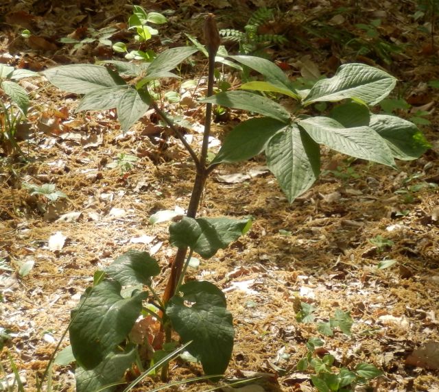 芽だし時にすでに暗紫色の仏炎苞が伸び始めている。(2016/3/16)