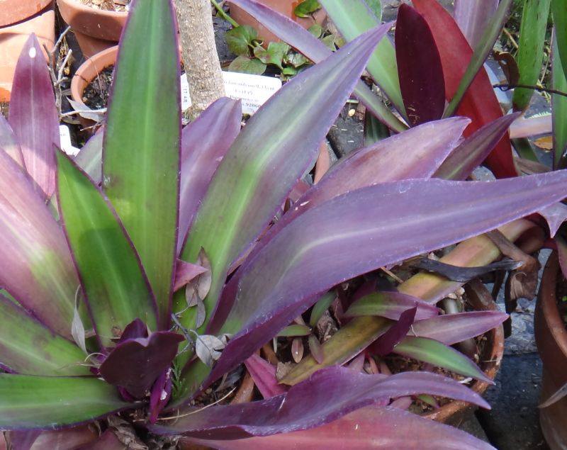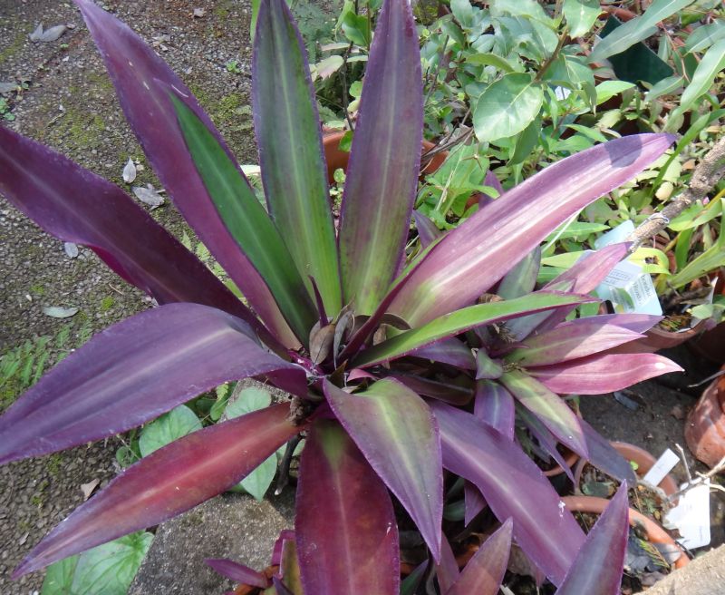 広線形の葉が根生し、葉表は紫がかった緑色、葉裏は赤紫色。