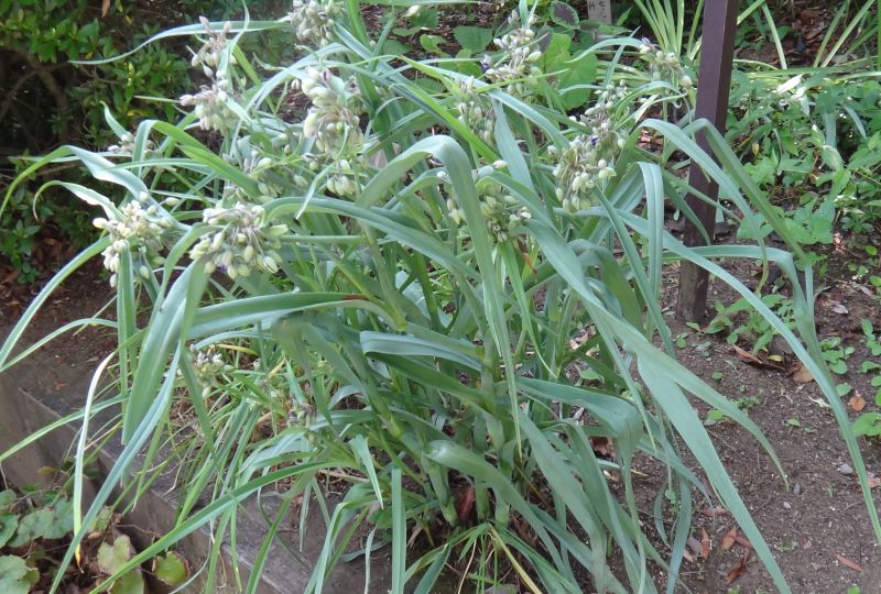 オオボウシバナ :花弁は青くて2枚、花茎約4センチ、高さ約100センチ。