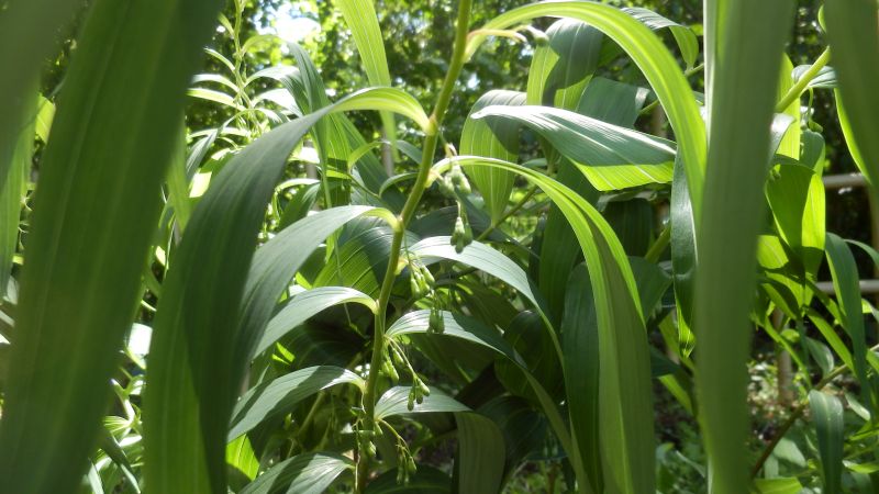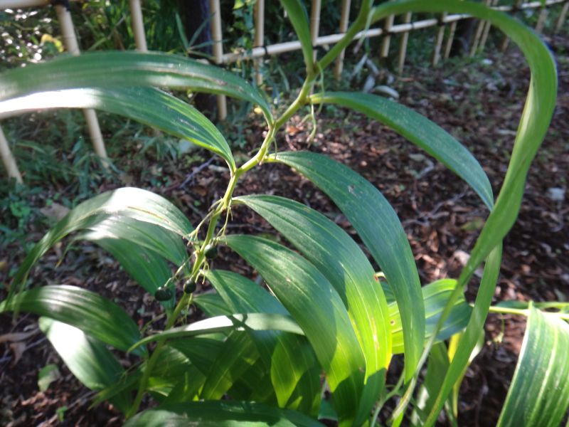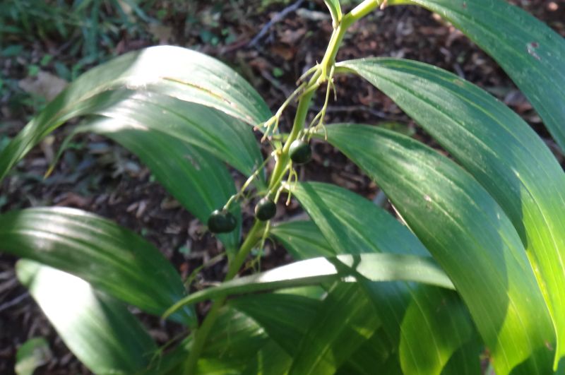 マルバオウセイ:ナルコユリと似ているが、葉が幅広の長卵形で、葉裏で脈が盛り上がる。