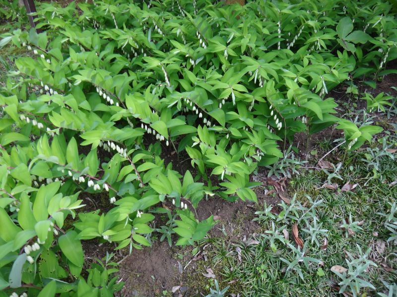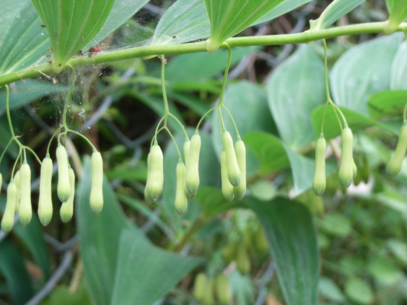 オオアマドコロ:筒状花が2〜4個ずつ垂れる、花弁は合着、茎は弓形で丸くて滑らか、節間が長い、葉幅は3〜8センチ、高さ60〜100センチ。
