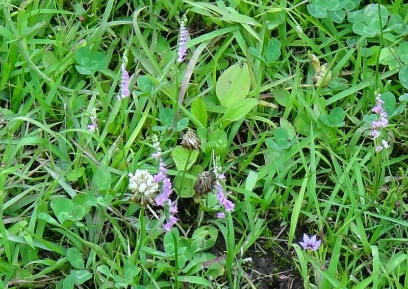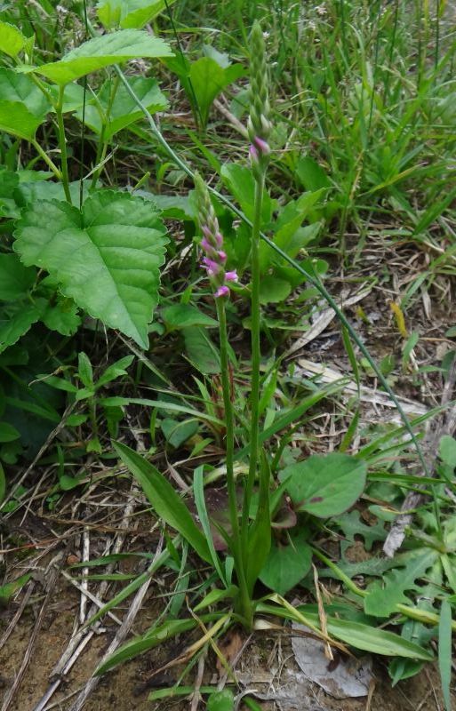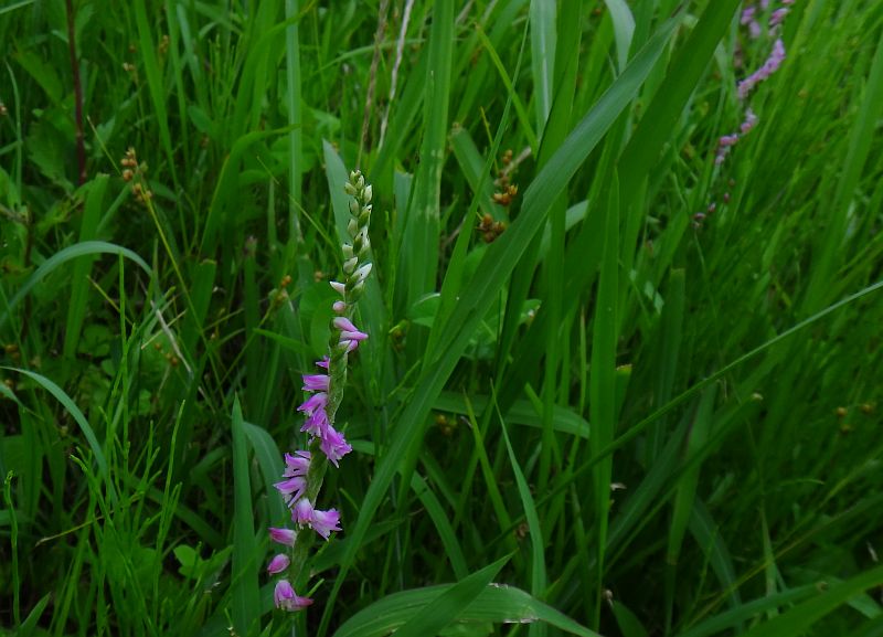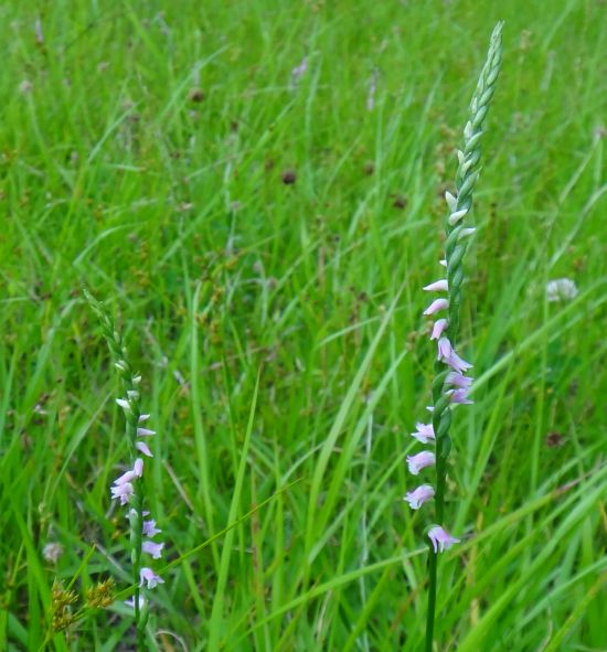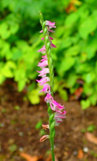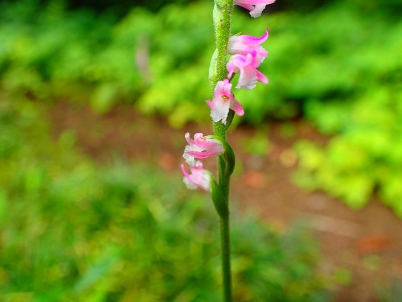 茎先に小さい淡紅色の花を螺旋状に咲かせる。