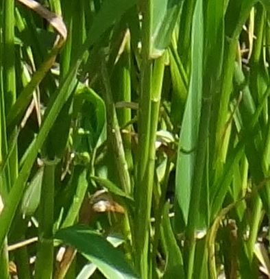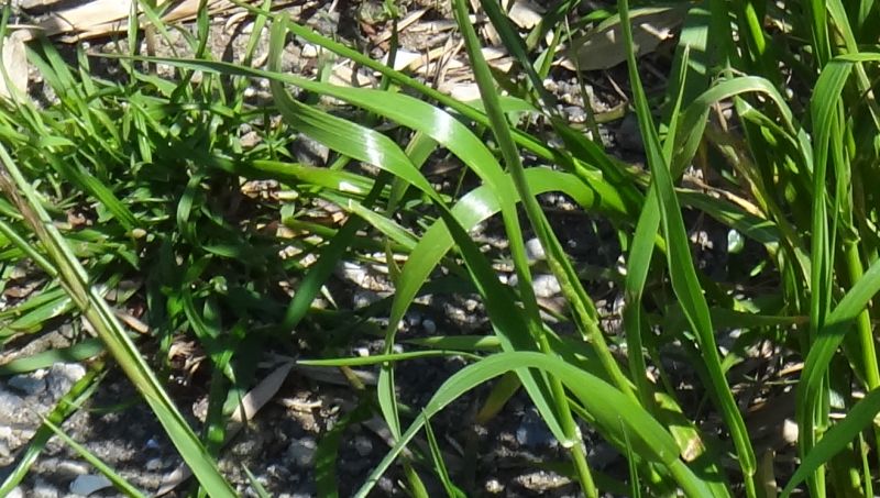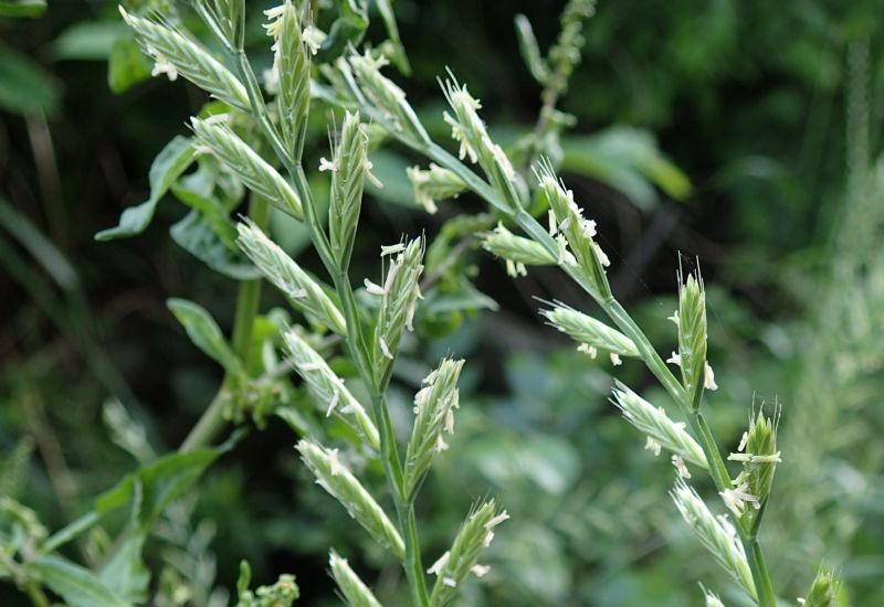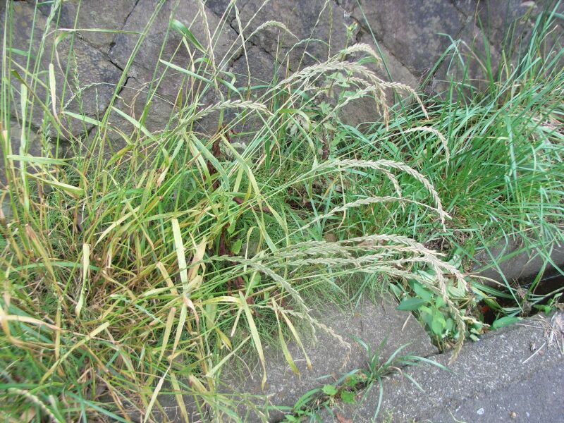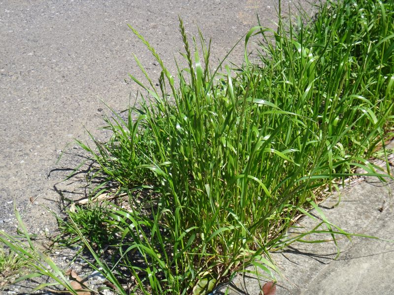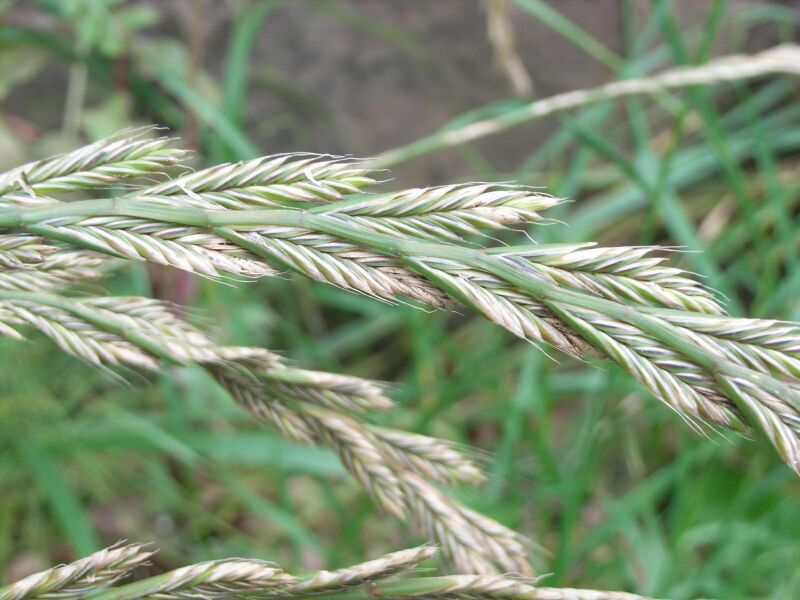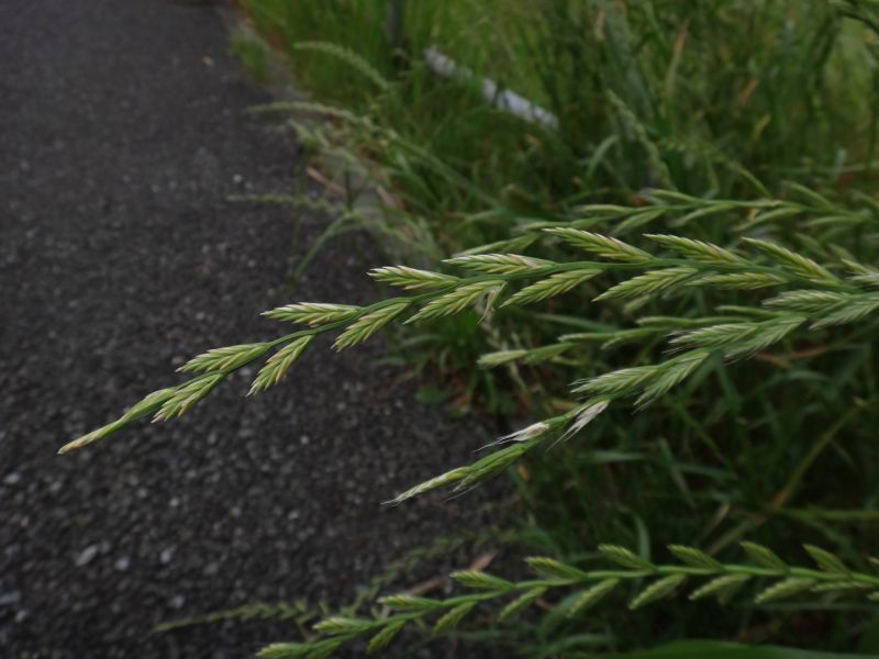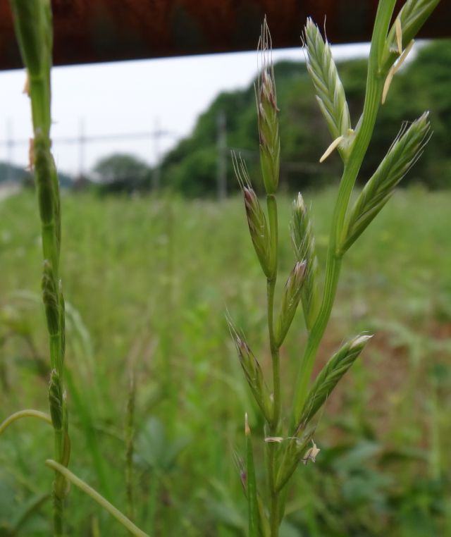 ホソムギ :多年草、葉幅2〜4ミリ、葉耳不明瞭、芒は無または微、小花6〜14個。