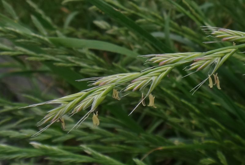 ネズミムギ:1〜2年草、葉幅3〜8ミリ、葉耳明瞭、芒は約1センチ、小花10〜20個。