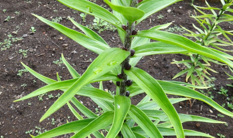 下部の葉の基部に黒紫色の丸い珠芽(ムカゴ)がつく。