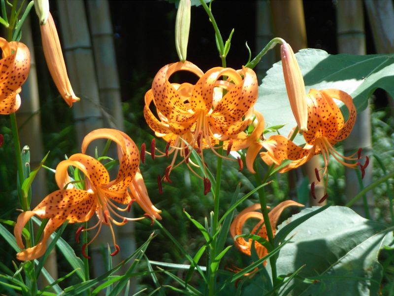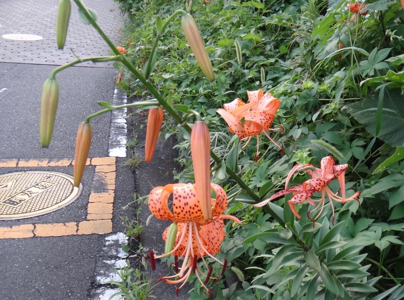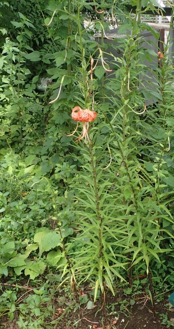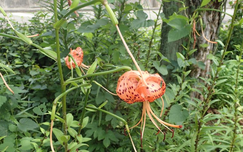 オニユリ :花は赤橙色で強く反り返り、夏咲き、結実希でムカゴがつく。