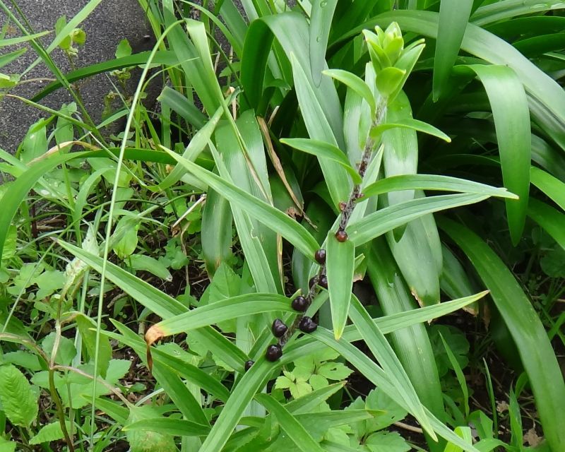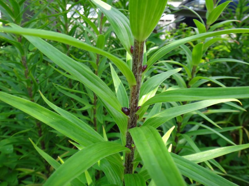 茎は直立し、暗紫色の斑点がある。葉は披針形。(2017/6/24)