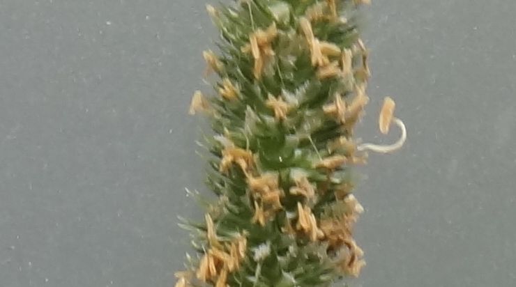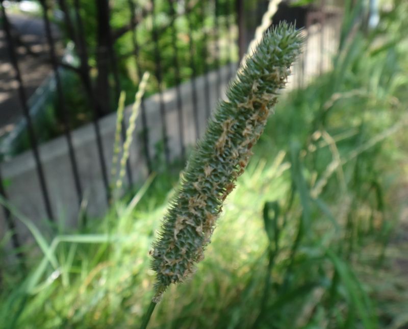 淡緑色で細長く扁平な小穂が隙間なく密集する。表面に褐色の葯がつく。