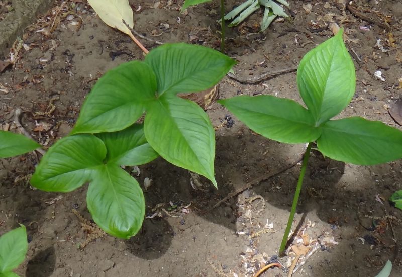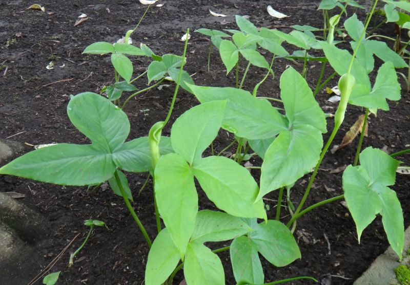 球茎から、長さ約30センチの葉柄を持つ数本の葉が出る。