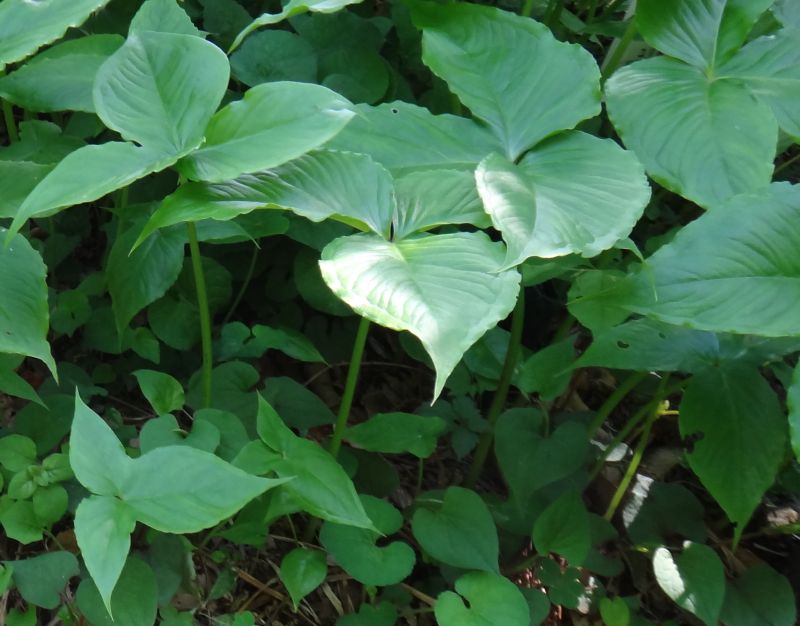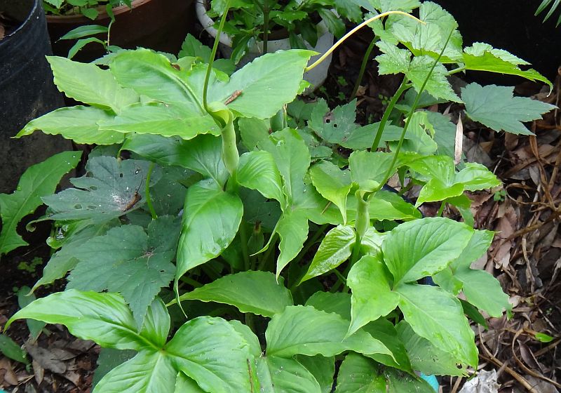 緑色の細長い筒形の仏炎苞に包まれた肉穂花序をつける。