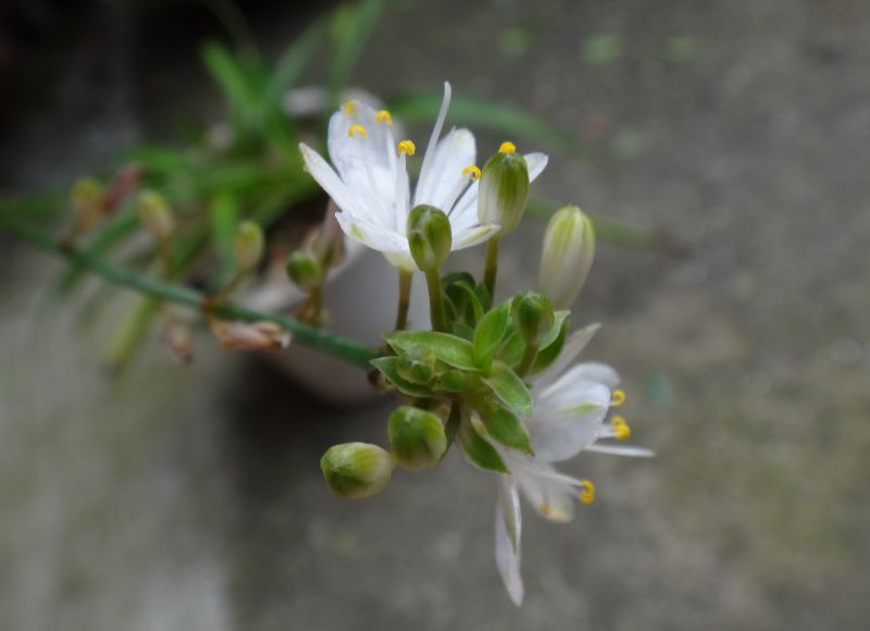 細長い花径を数本のばして、その途中や先に白い小さい6弁花を1つずつつける。