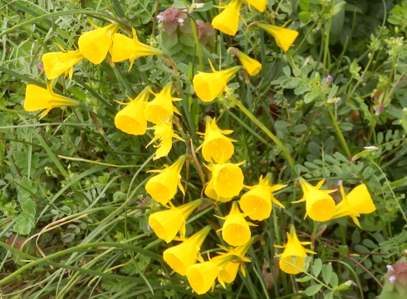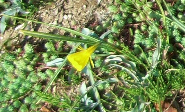 早春に花茎が直立し、らっぱ状の黄色い花を茎先に1つずつ咲かせる。