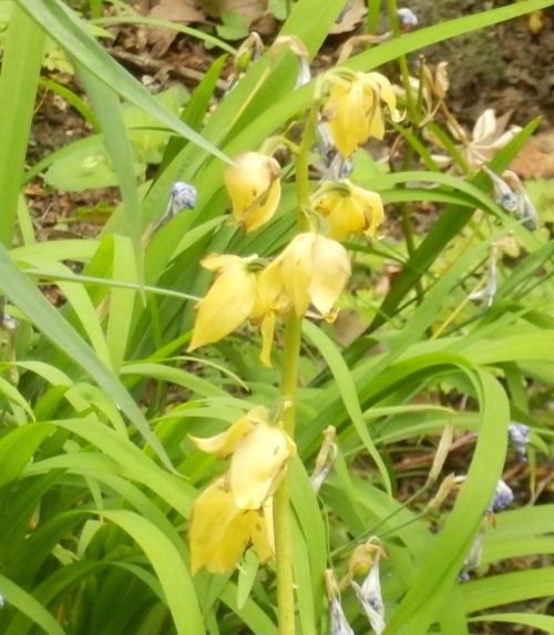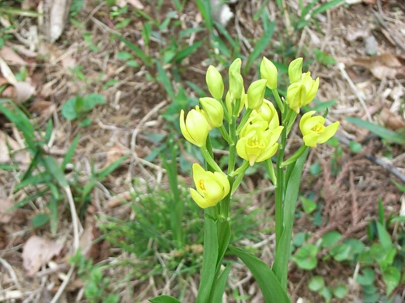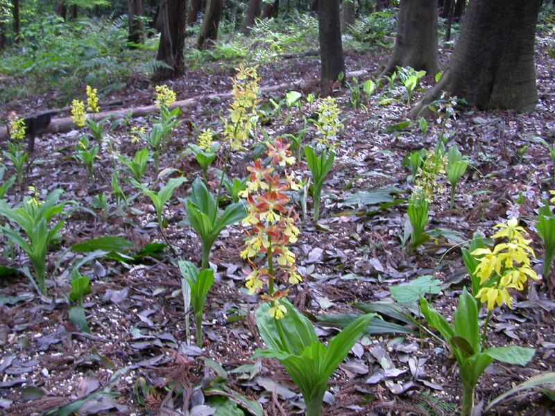 エビネに似ているが、葉が大きく、花は鮮黄色で、