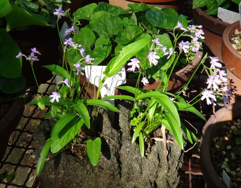 葉の間から花茎を出して、赤紫色の左右相称の花を数輪互生させる