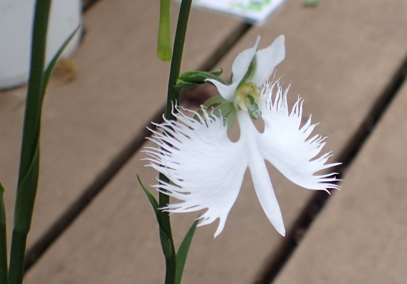 白鷺が飛んでいるような形の白い花をつける