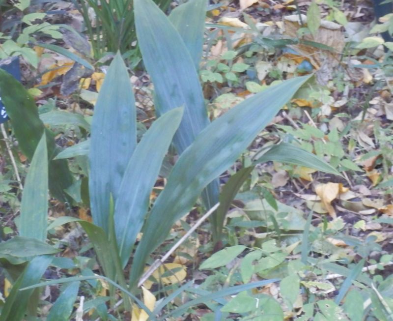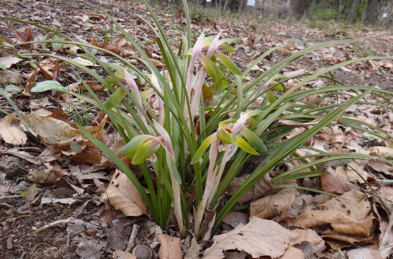 地中の偽球茎から3〜5枚の長楕円形で先のとがった葉を出し、